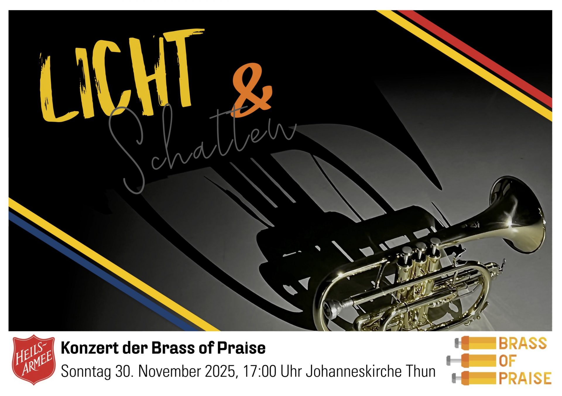 Die nationale Brass Band der Heilsarmee Schweiz – Brass of Praise – und das Heilsarmee Korps Thun laden dich zu diesem Jahreskonzert ein. Unter dem Titel «Licht und Schatten» erlebst du ein musikalisches Programm voller Kontraste und Farben. Werke wie Out of Darkness, Light Song, Shine as the Light und Let me be a Light nehmen dich mit auf eine Reise vom Dunkel ins Licht.