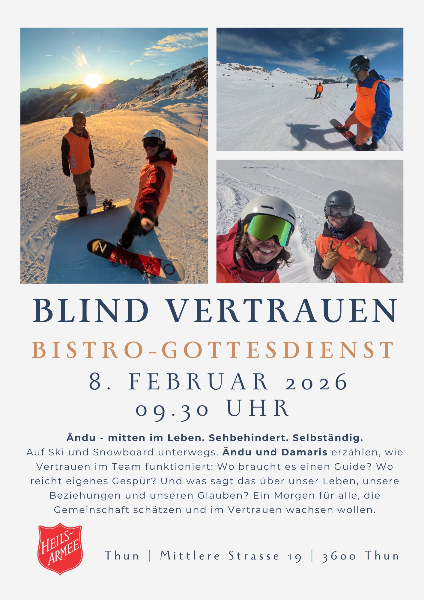 Manchmal ist Vertrauen das unsichtbare Band, das uns durchs Leben trägt. Aber wie sieht das aus, wenn die Sicht fehlt – buchstäblich? Am Sonntag, 8. Februar 2026 um 09:30 Uhr laden wir dich herzlich zum nächsten Bistrogottesdienst im Korps Thun ein. Das Thema: Blind Vertrauen.
